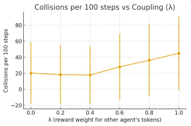 Low coupling (λ < 0.5): ~20 collisions/100 steps, throughput ≈ 40 tokens/100 steps.